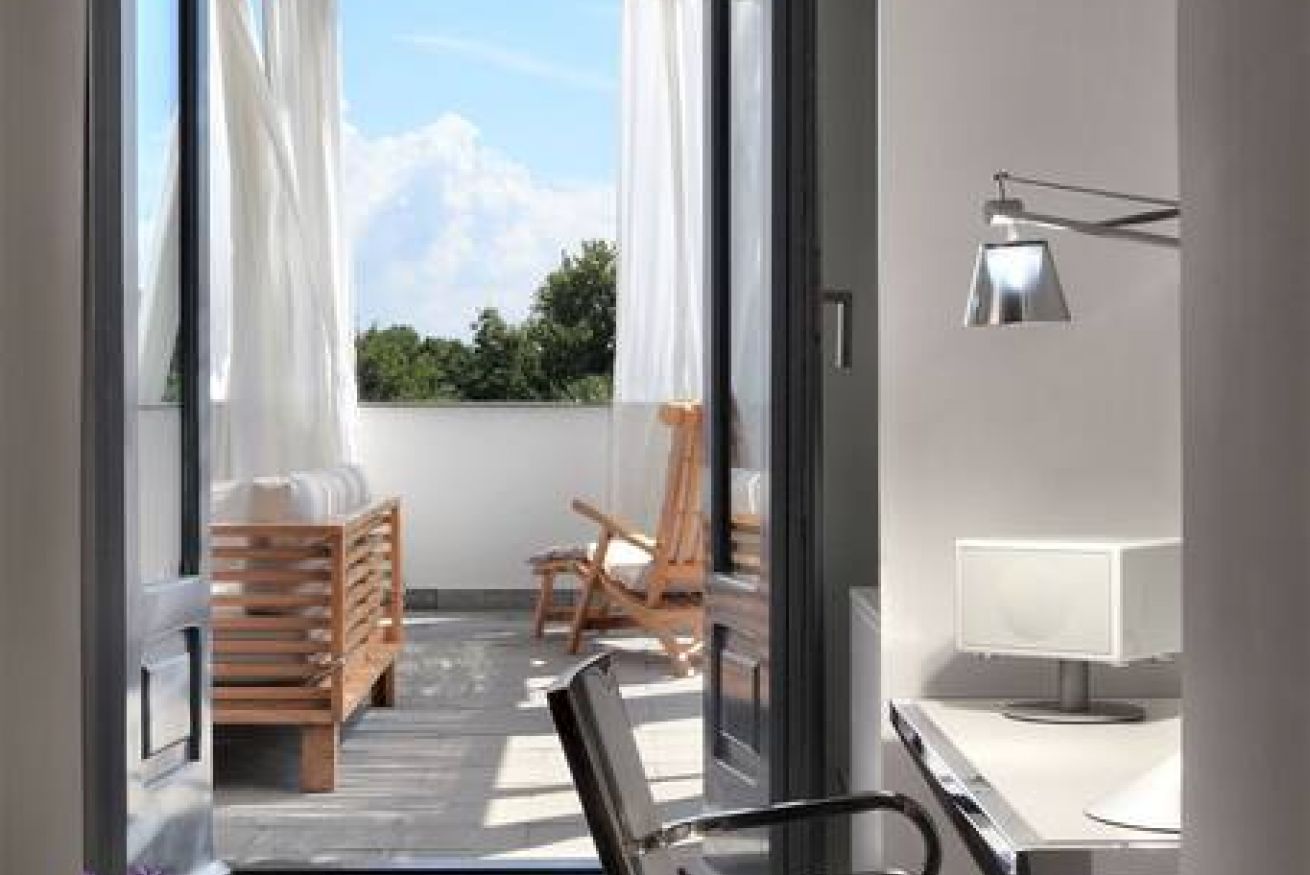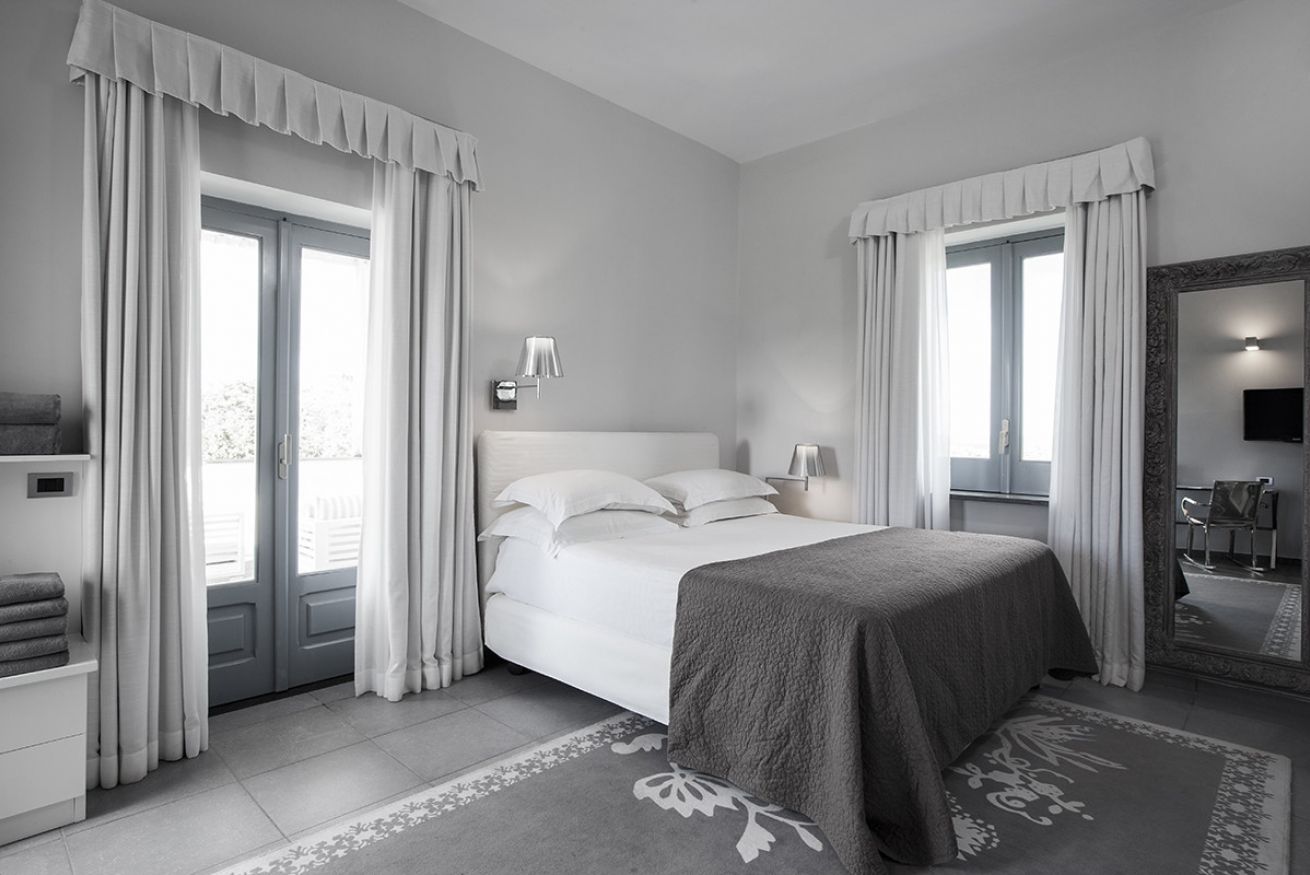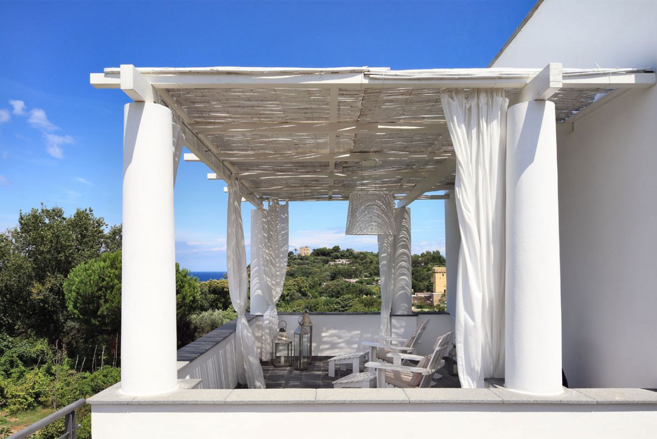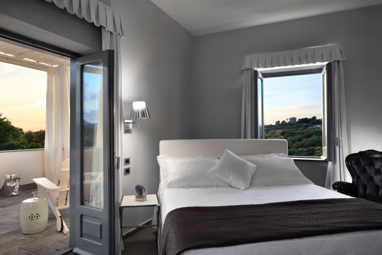The Terrazza Suite is a harmonious blend of charm, design and luxury. The private terrace, furnished with stylish lounge chairs, and a small table, was created to help guests enjoy the beautiful and sunny environment in privacy. The private terrace offers an amazing view of the Island of Procida, the Mediterranean landscape, the bio-garden, and the modern swimming pool. The Terrazza Suite will make your stay on the island of Procida an exclusive and completely unforgettable experience.